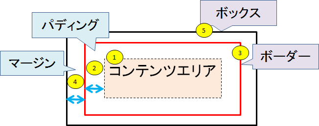 コンテンツエリア、パディング、ボーダー、マージンから構成されています。