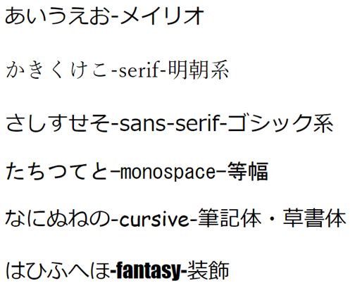| 複数のフォントを指定できます。優先順位の高いものから順にカンマ区切りで記述します。 名称にスペースがある場合はダブルコーテーションまたはシングルコーテーションで囲みます。例:"MS Pゴシック" |