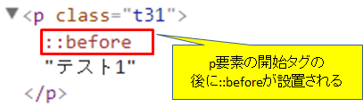P要素の開始タグの後に::beforeが設置されます。画面の表示では::beforeの箇所に文言が表示されます。