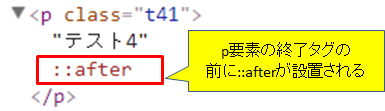 P要素の終了タグの前に::afterが設置されます。画面の表示では::afterの箇所に文言が表示されます。
