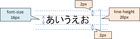- font-sizeが16pxでline-heightが20pxとした場合、以下の図のようにfont-sizeが16pxで、上下に2pxずつ設定されます。