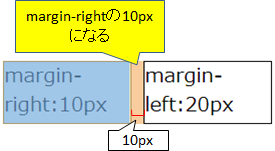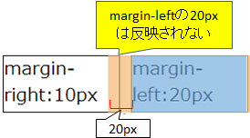 float:leftを指定した左のボックスのmargin-rightが10pxで、右のボックスのmargin-leftが20pxの場合、10pxになります。(以下の図1と図2)