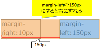 右のボックスのmargin-leftを150pxにしてその左端がブラウザの左端に到達していた場合、右のボックスがブラウザの左端から150pxの幅をとって右にずれます。