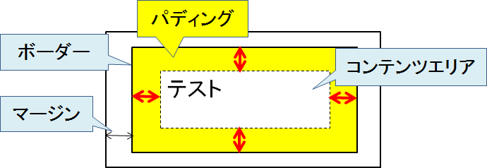 - 要素の枠内の余白を指定します。ボーダーとコンテンツエリアの間です。(下の図の黄の部分)