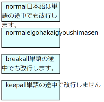 | normal | 言語のデフォルトの改行ルールを使用します。日本語は単語の途中でも改行します。英字は改行しません。 (初期値) |