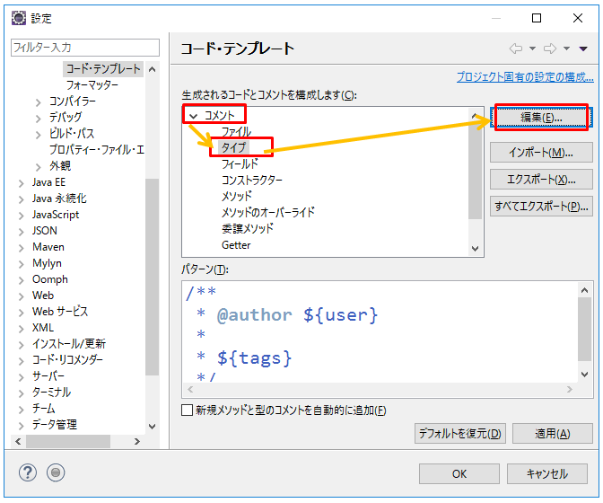 2.「Java」>「コード・スタイル」>「コード・テンプレート」をクリックします。