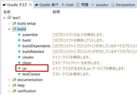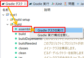 1.「Gradleタスク」タブの「jar」を右クリックして「Gradleタスクの実行」をクリックするとjarを出力します。