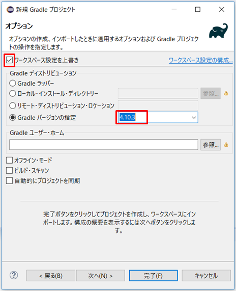 チェックを外すとGradleバージョンを選択できます。次へをクリックします。