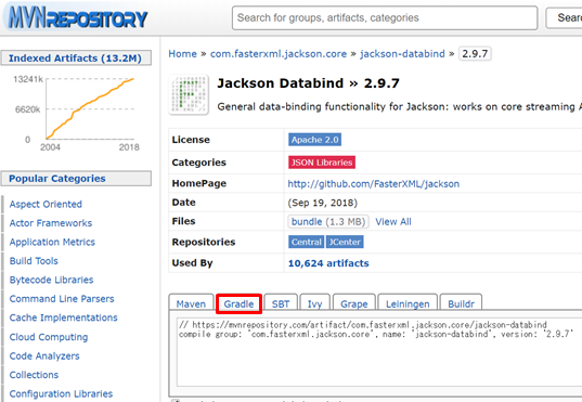 2.Jackson Databindのページにある画面の赤枠の「Gradle」のタブをクリックしその下の枠にある文字列をコピーします。