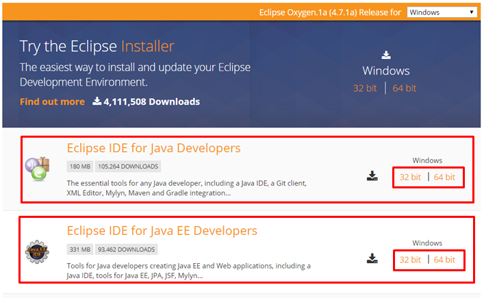 1-1.「Eclipse IDE for Java Developers」または「Eclipse IDE for Java EE Developers」を探します。Web開発であれば「Eclipse IDE for Java EE Developers」を選択します。