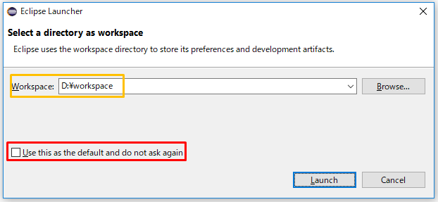 下図の赤枠の「Use this as the default and do not ask again」にチェックを入れると次回のEclipse起動時にこのダイアログが表示されなくなります。