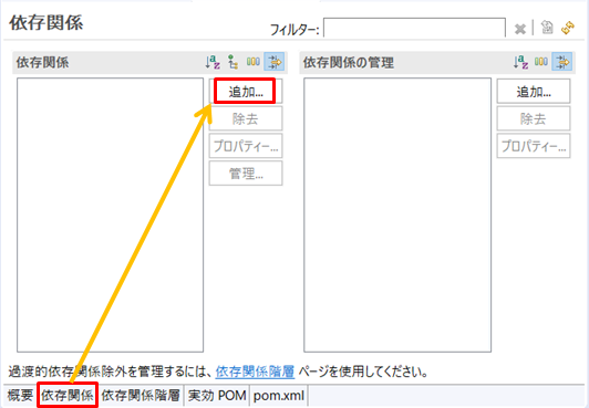 1.pom.xmlをダブルクリックして開き、依存関係タブをクリックし、追加ボタンを押します。