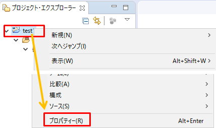 1.プロジェクト・エクスプローラー等で、「プロジェクト」または「フォルダ」または「ファイル」を右クリックして「プロパティ」をクリックします。下の図はプロジェクトを右クリックした例です。