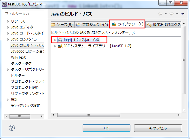 Eclipse4.6以前の場合は、「ライブラリー」>「外部JARの追加」をクリックし、log4j-1.2.17.jarを選択します。