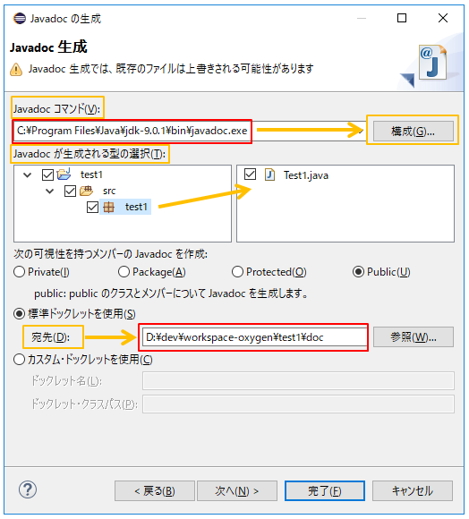 ②「Javadocが生成される型の選択」でJavadocを生成するファイルを選択します。