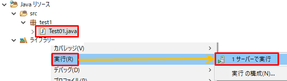 Test01.java上で右クリックして「実行」→「サーバーで実行」をクリックします。