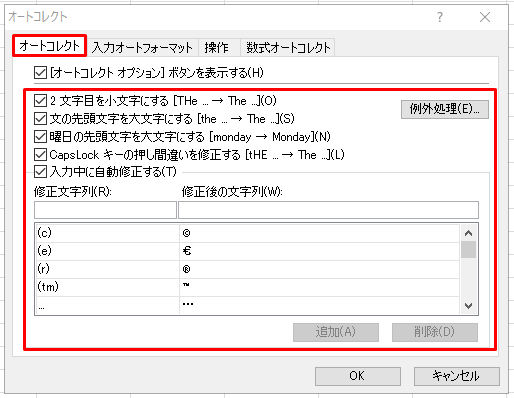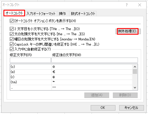 (補足)「例外処理」をクリックするとオートコレクトの例外を設定をすることができます。