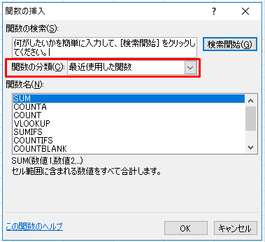 「関数名」に使用したい関数がない場合で、関数名がわかっている場合は、