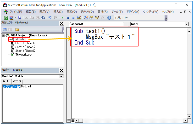 2.標準モジュールのModule1を選択し、コードウィンドウにコードを記述します。