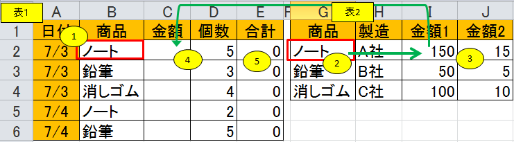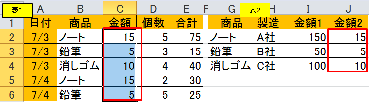 表2の「ノート」、「鉛筆」、「消しゴム」の商品ごとの金額1が、表1の商品にあわせてC列の金額にセットされます。