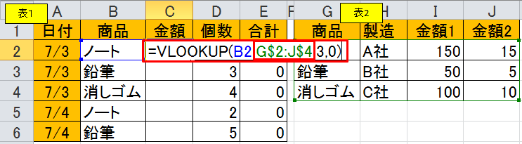 手順4・・・表2のI2の「150」を表1のC2の「金額」にセットします。