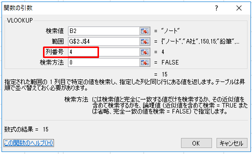 「関数の引数」のダイアログで、列番号を4とした場合です。
