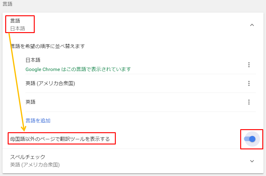 5.英語の横の印をクリックして、「この言語のページで翻訳ツールを表示する」にチェックを入れます。