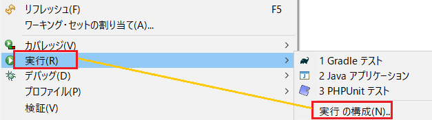 1.javaファイルを右クリックして「実行」→「実行の構成」をクリックします。