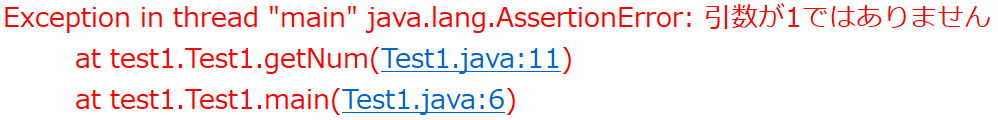 3.コードが実行されると、java.lang.AssertionErrorの例外が発生しコードに設定した文言が表示されます。