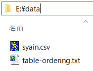 場所は、ドライブ直下のdataフォルダにsyain.csvとtable-ordering.txtを配置しています。