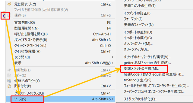 2.ダイアログで「ソース」→「委譲メソッドの生成」をクリックします。