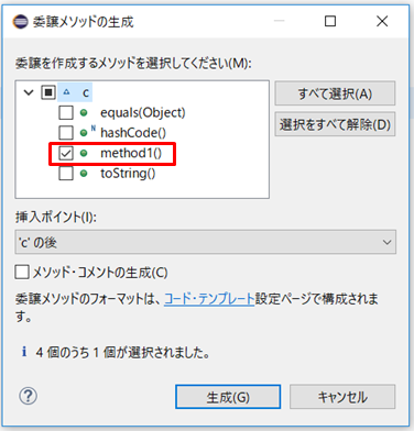method1()にチェックを入れて「生成」をクリックすると上記コードの2.委譲しているクラスと同じコードになります。