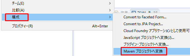 2.「構成」>「Mavenプロジェクトへ変換」をクリックします。