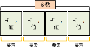 →連想配列とは添字(キー)に文字列を使用できる配列です。 - キーの重複は許されません。