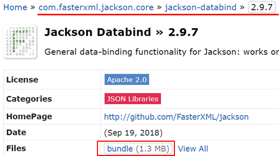 上記リンクの「Group: FasterXML Jackson Core」のページから、 jackson-databindをクリック→2.9.7をクリックして、以下の図の「Files」の横にあるbundleをクリックするとjarファイルをダウンロードできます。