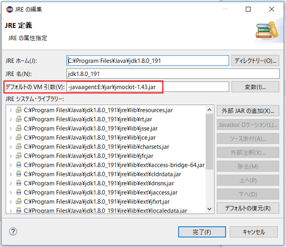3.「デフォルトのVM引数」に「-javaagent: 」とjmockitのパスを入力して完了を押します。