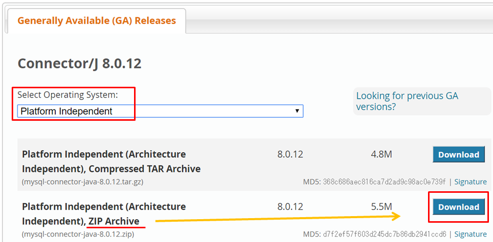 2.Select Operating SystemでPlatform Independentを選択するとダウンロードボタンが表示されます。ZIP Archiveの「Download」ボタンを押します。