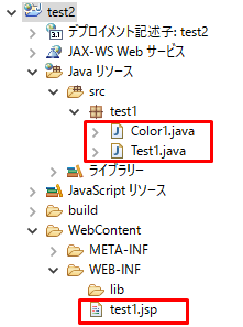 ページ表示時のアクセスの順番は、Test1.java → Color1.java → test1.jspです。