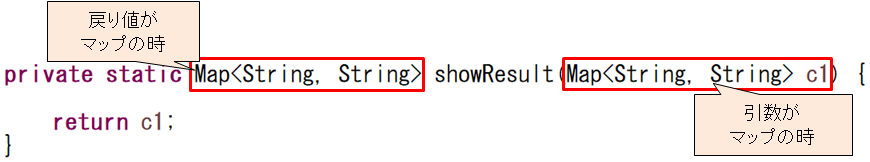 12行目は、呼び出し元のメソッドです。引数(実引数)にマップを指定しています。戻り値もマップです。