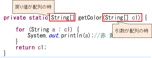 11行目は、定義されたメソッドです。引数(仮引数)に配列があります。戻り値も配列です。(以下の図を参照)
