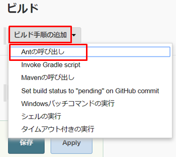 3.「ビルド手順の追加」をクリックし、「Antの呼び出し」をクリックします。