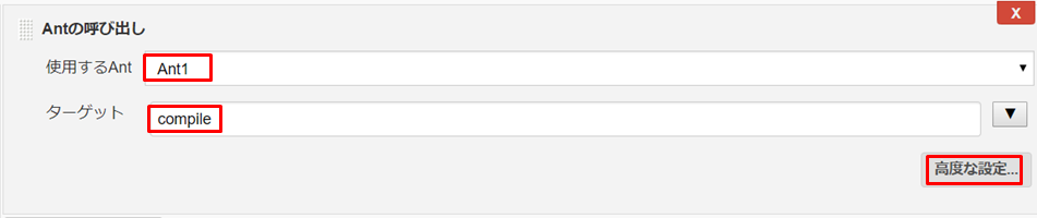 4.「使用するAnt」で上記手順で設定したAntを選択し、「ターゲット」は、build.xmlのtargetのnameを指定します。ここではcompileを入力しました。その後、「高度な設定」をクリックします。