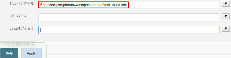 5.「ビルドファイル」にEclipseで設定したbuild.xmlをパス付きで入力し、保存ボタンを押します。完了後、保存ボタンを押します。