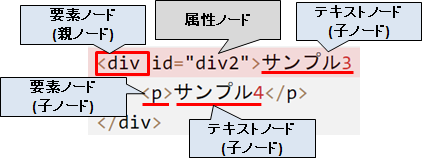 6行目の文字の「サンプル3」は、divタグ(<div id = "div2">)の子ノードです。