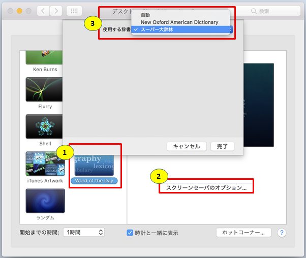 ②の「スクリーンセーバのオプション」をクリックすると③で使用する辞書を選択できます。