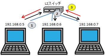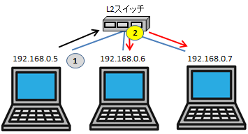2.L2スイッチ(スイッチングハブ)は、ARPを受け取るとポートに繋がっている他の全てのパソコン転送します。