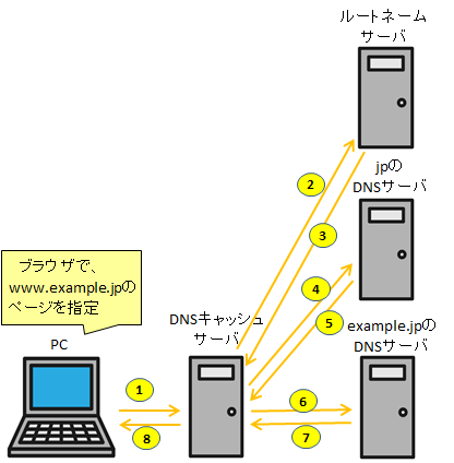 - ⑥ example.jpのDNSサーバへ問い合わせします。