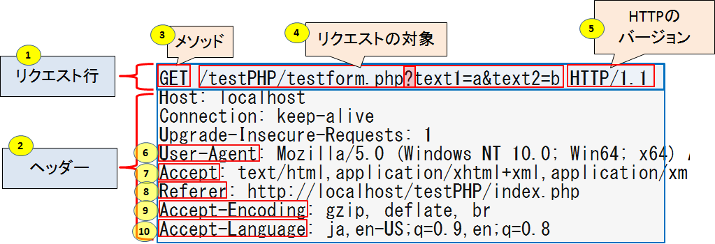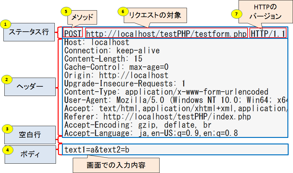 →値が複数ある場合は「&」でつなげます。 - HTTPのバージョンです。