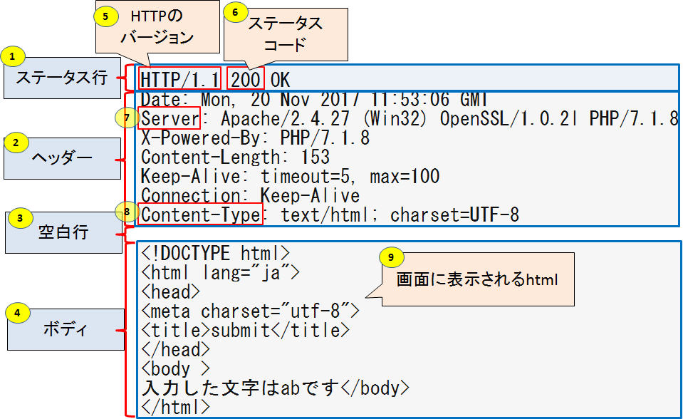 - ステータスコードです。200はWebサーバーの処理が成功したことを表します。