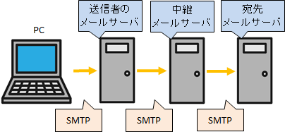 - 送信の方法は、PCのメールソフトから送信者のメールサーバ→中継メールサーバ→宛先のメールサーバとサーバを中継します。
